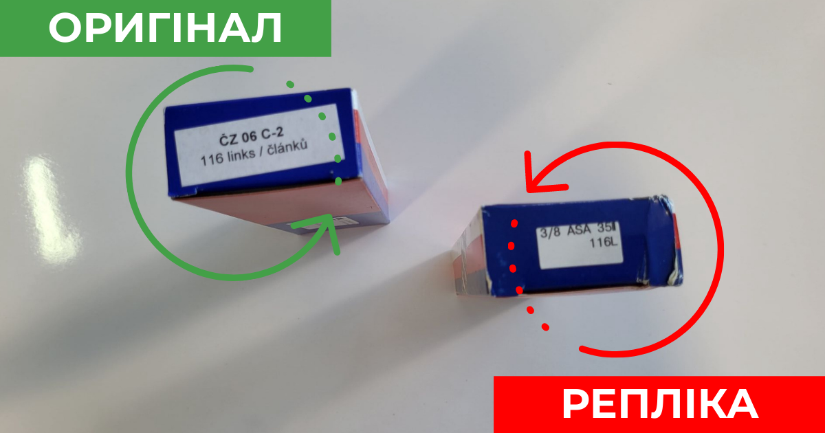 На боковой грани коробки реплики, как и у оригинала, присутствует стикер, только вот с обозначениями какая-то лажа. Оригинал содержит маркировка согласно ISO 06с-2, а вот реплика согласно ASA/ANSI 3/8’’ и просто 35, хотя международное обозначение для двухрядной цепи 35-2. Количество звеньев у обеих цепей одинаковое 116 штук.