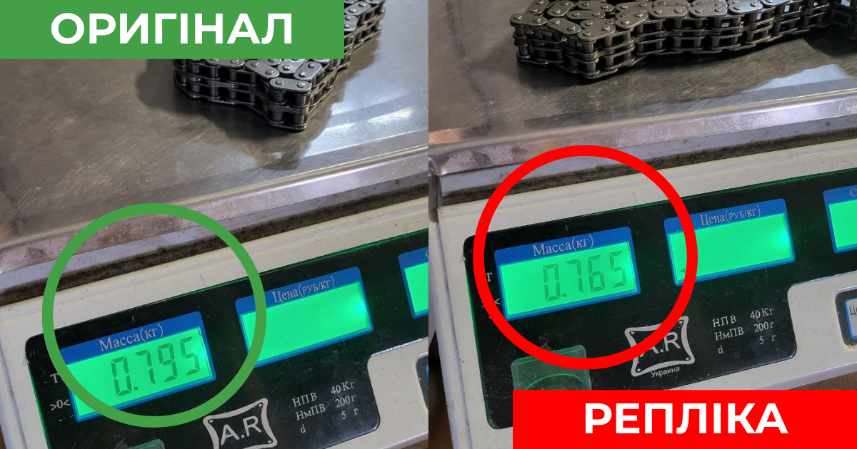 Оригинал – 0,795кг, а реплика – 0,765кг. Здесь, нам сложно судить насколько это критично, поскольку мы не разбирали цепи и не проводили геометрические замеры, а также не проверяли цепи по разрывному усилию.