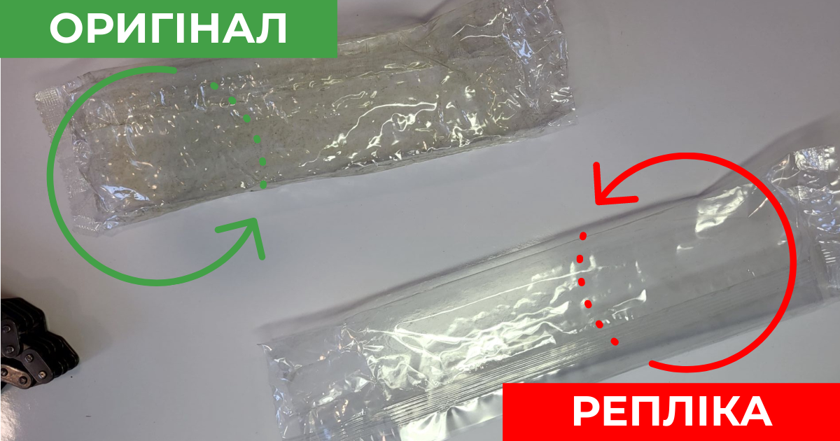 Оригинальная цепь находится в полиэтиленовом запаянном пакете, имеет большую плотность по сравнению с репликой. На поверхности полиэтилена оригинала присутствуют следы масла.