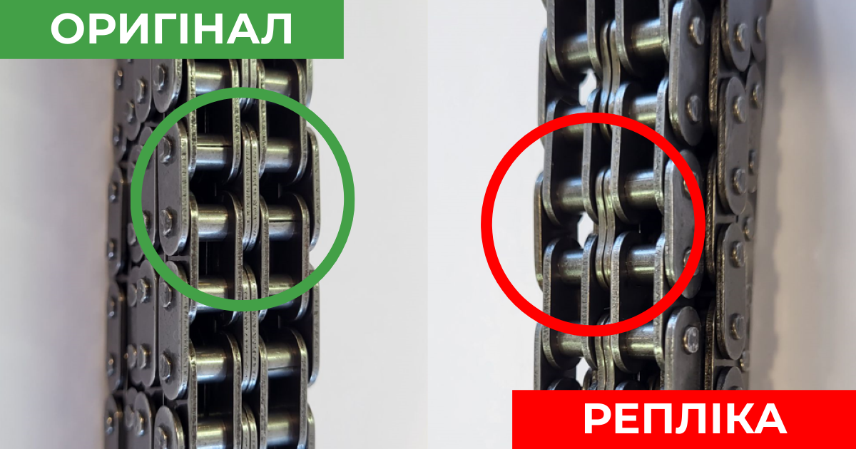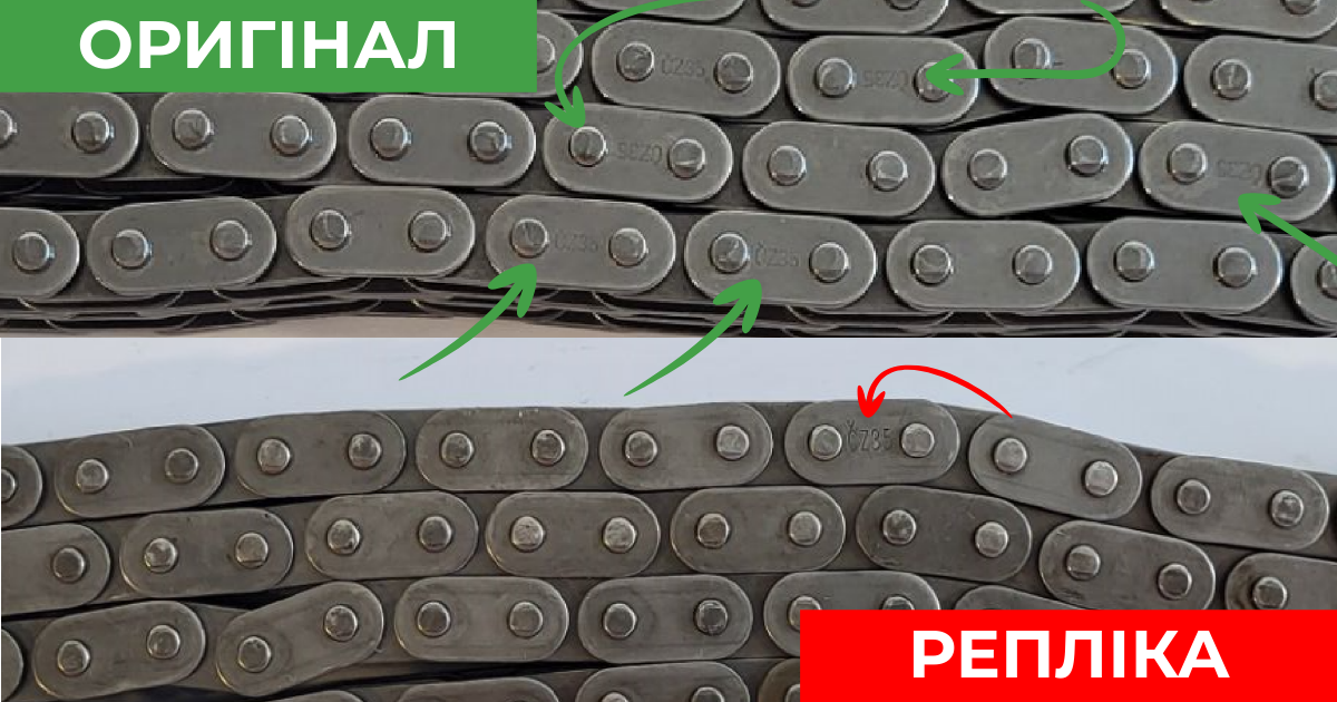 Визуально шрифт маркировки на реплике отличается от оригинала, кроме того, количество повторений клейма обозначения цепи на оригинале – 13 раз, а у реплики – только 4 раза.